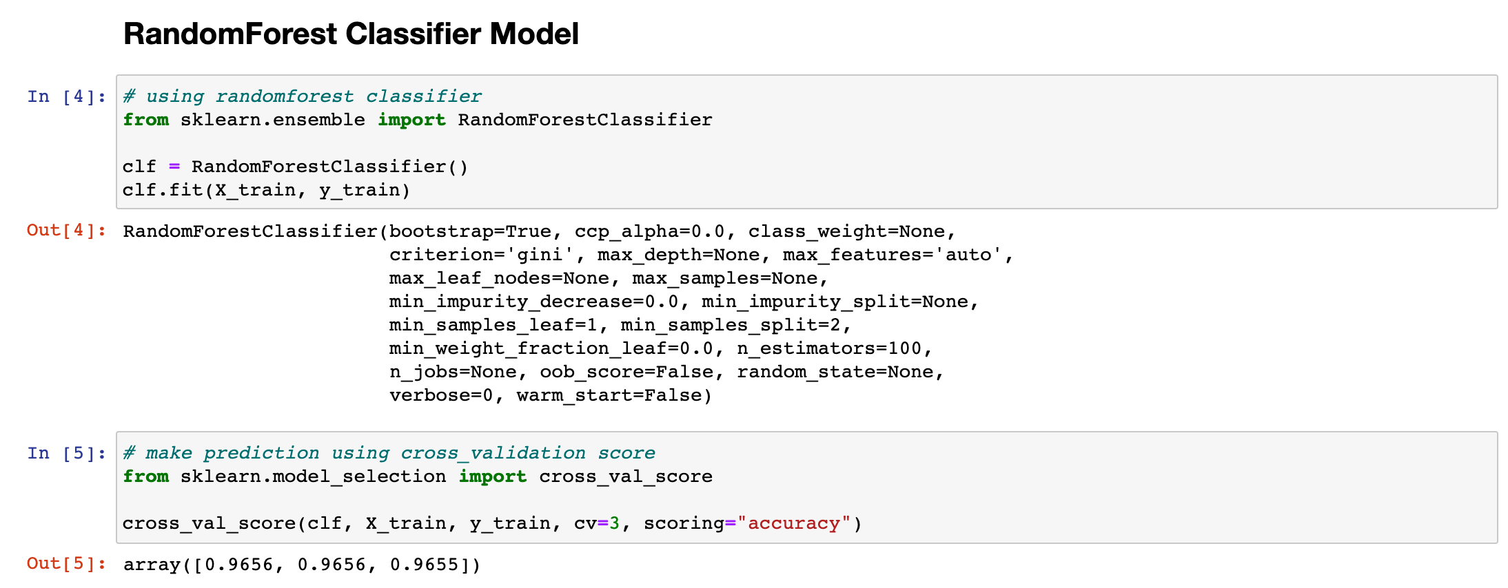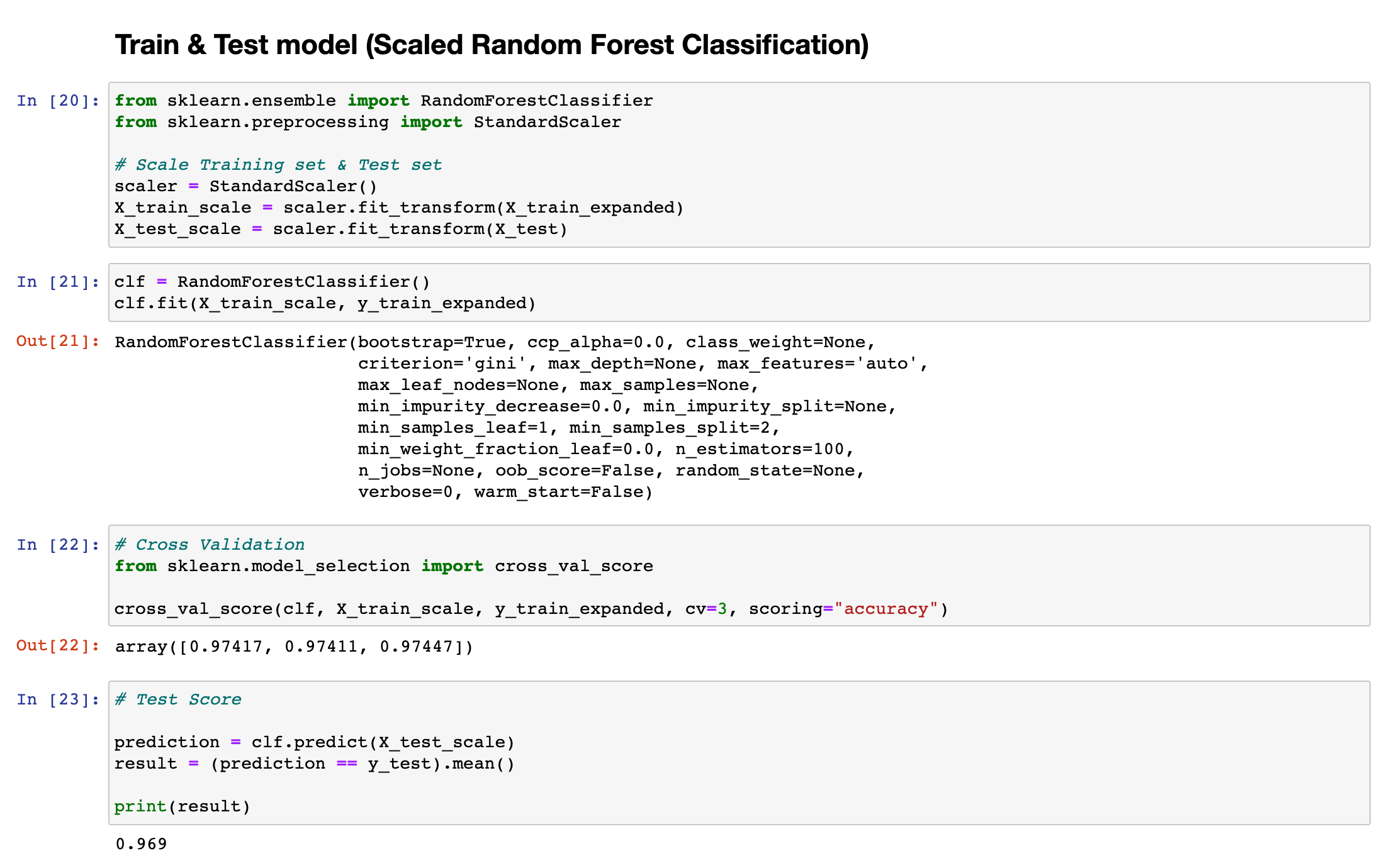 Random Forest Model에 대해서는 이후 포스팅을 통해 추가적으로 다룰 예정입니다. (의사결정트리의 한 종류). 테스트셋은 최종 모델의 정확도를 판단할 때만 사용할 예정이므로 중간 모델의 정확도는 Cross_Validation과정을 통해 예측합니다. 예측결과 3번의 Cross_Validation 과정에서 모두 96% 이상의 정확도를 나타낸 것을 확인할 수 있습니다.