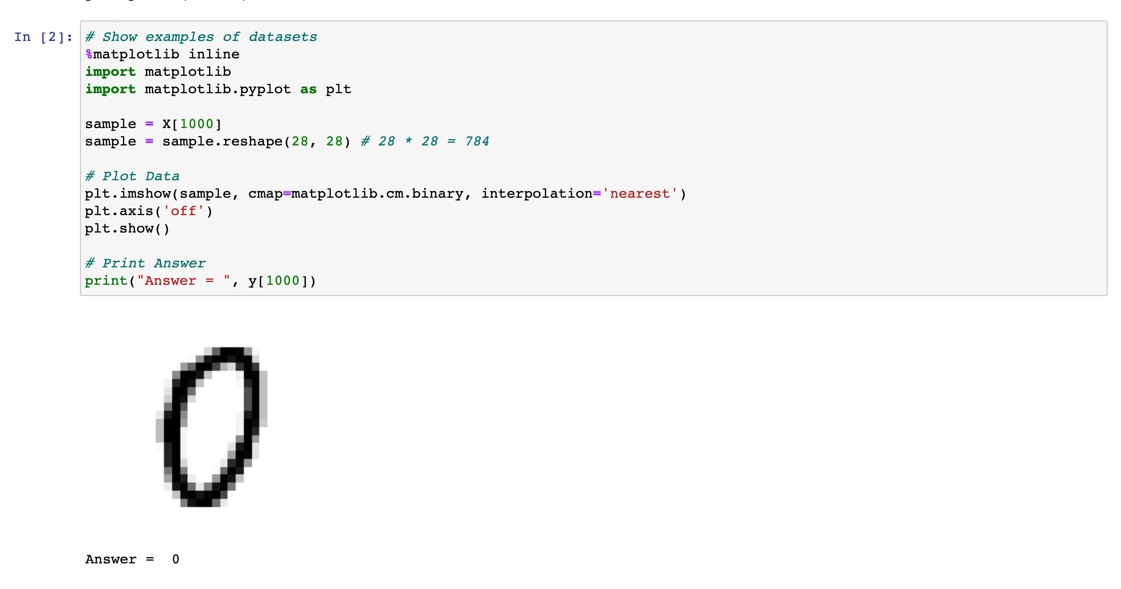 MNIST 데이터 값의 샘플입니다. 1000번째 데이터가 나타내는 28*28 이미지를 출력하였고, 해당 Training Set의 원소가 나타내는 label(Y값)은 0으로 제대로 데이터가 주어져 있음을 확인할 수 있습니다.