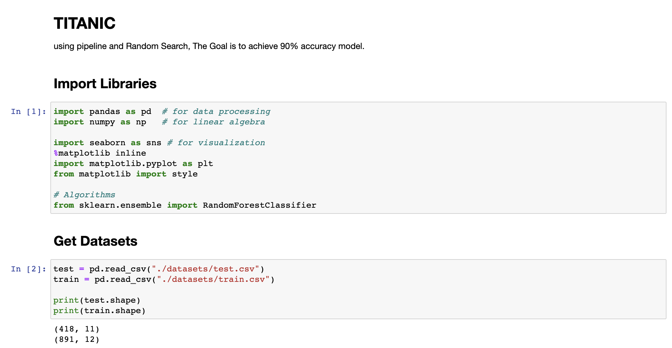Kaggle Titanic Tutorial 에서 해당 데이터셋과 여러 가지 가이드라인들을 제공받을 수 있으며, 동일한 데이터셋으로 다른 사람들이 어떤 모델을 가지고 어느 정도의 정확도를 나타내었는지도 확인해 볼 수 있습니다.