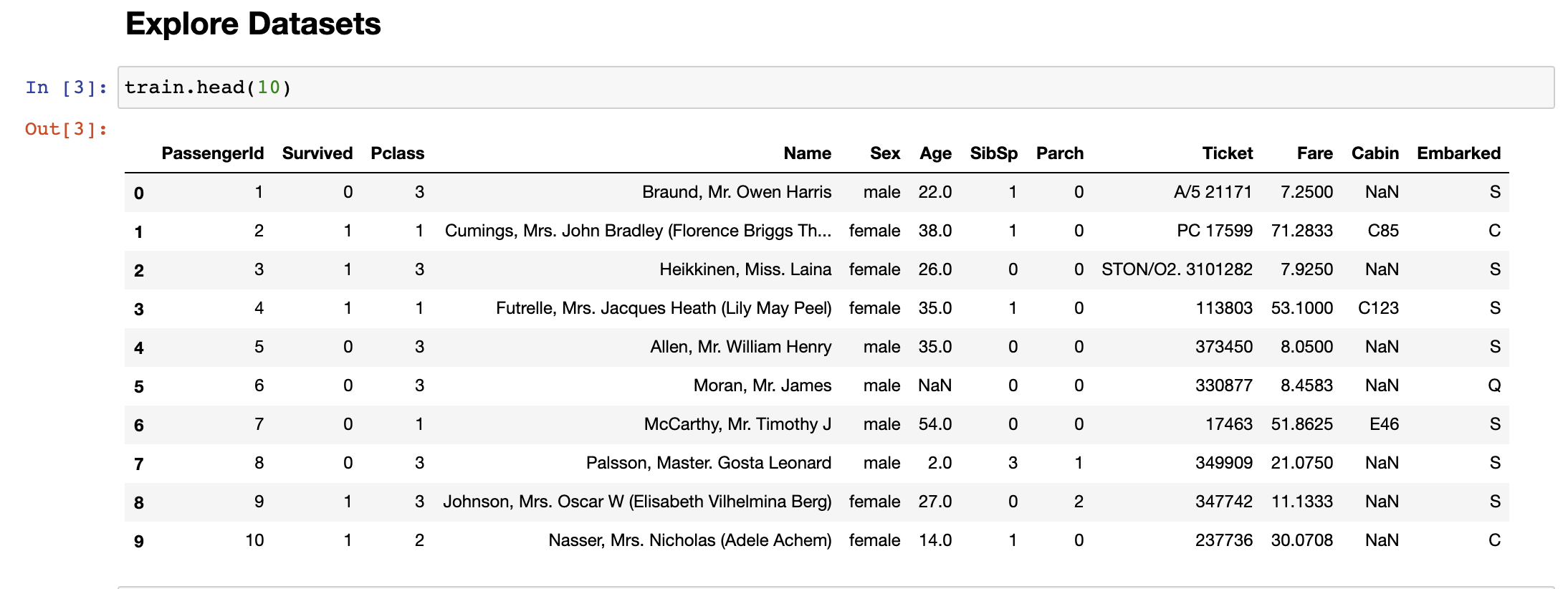 Embarked의 경우 2개만 NULL값이므로 데이터의 분포를 한번 살펴본 뒤에, 평균값이나 최빈값으로 채워넣으면 학습에 큰 지장이 없을 것으로 보입니다.