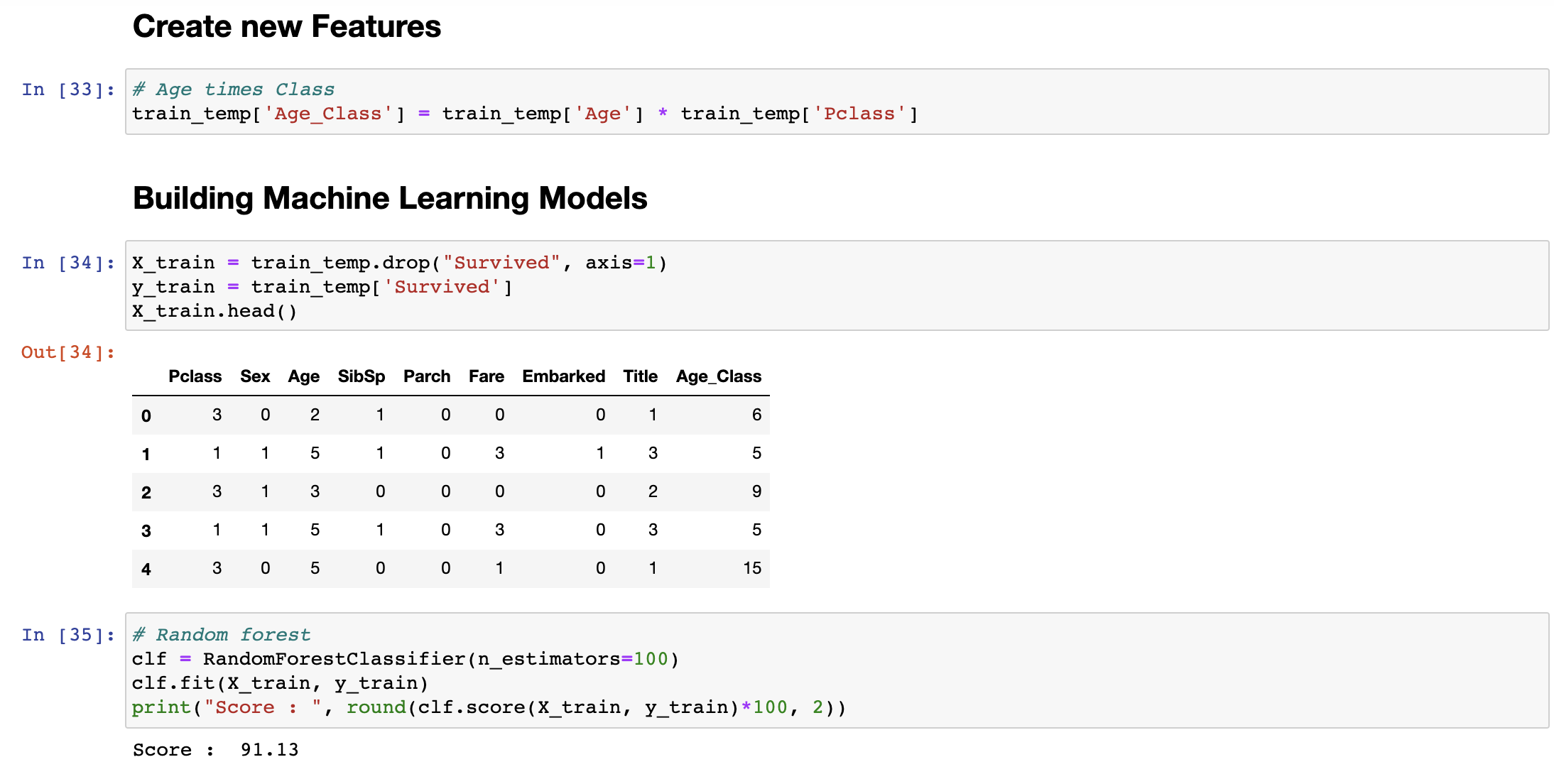 머신 러닝 모델에서 성능 향상을 위해 여러 Feature들을 곱해서 새로운 Feature를 만들어내는 경우가 있습니다. 이 데이터셋의 경우 나이와 클래스를 곱한 값을 추가해 주었습니다.
