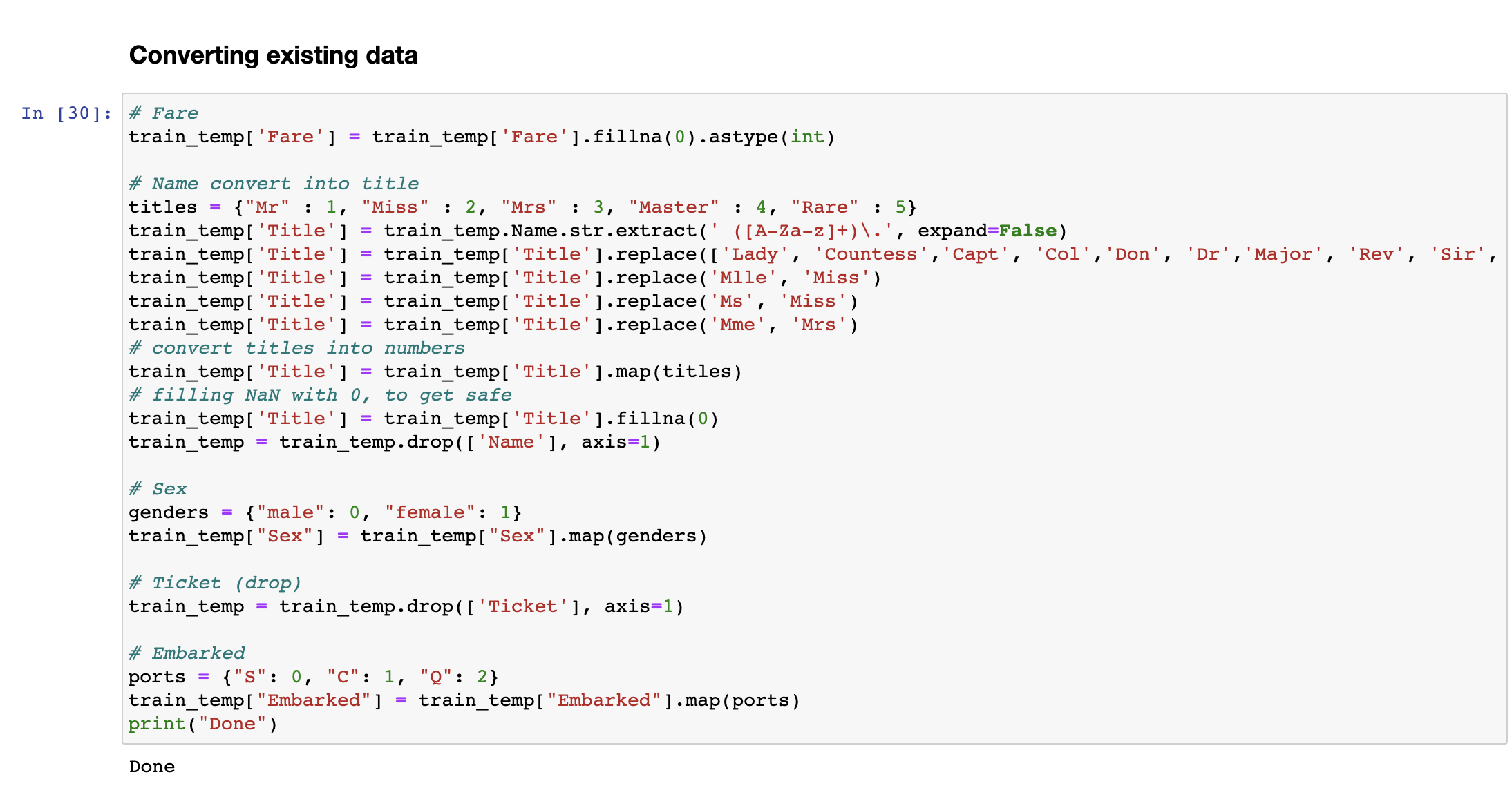 성별의 경우 학습에 용이하게끔 남자는 0, 여자는 1로 Mapping하여 넣어 주었고, Embarked도 마찬가지로 0, 1, 2로 카테고리화 하여 해당 정수로 값을 채워넣었습니다.