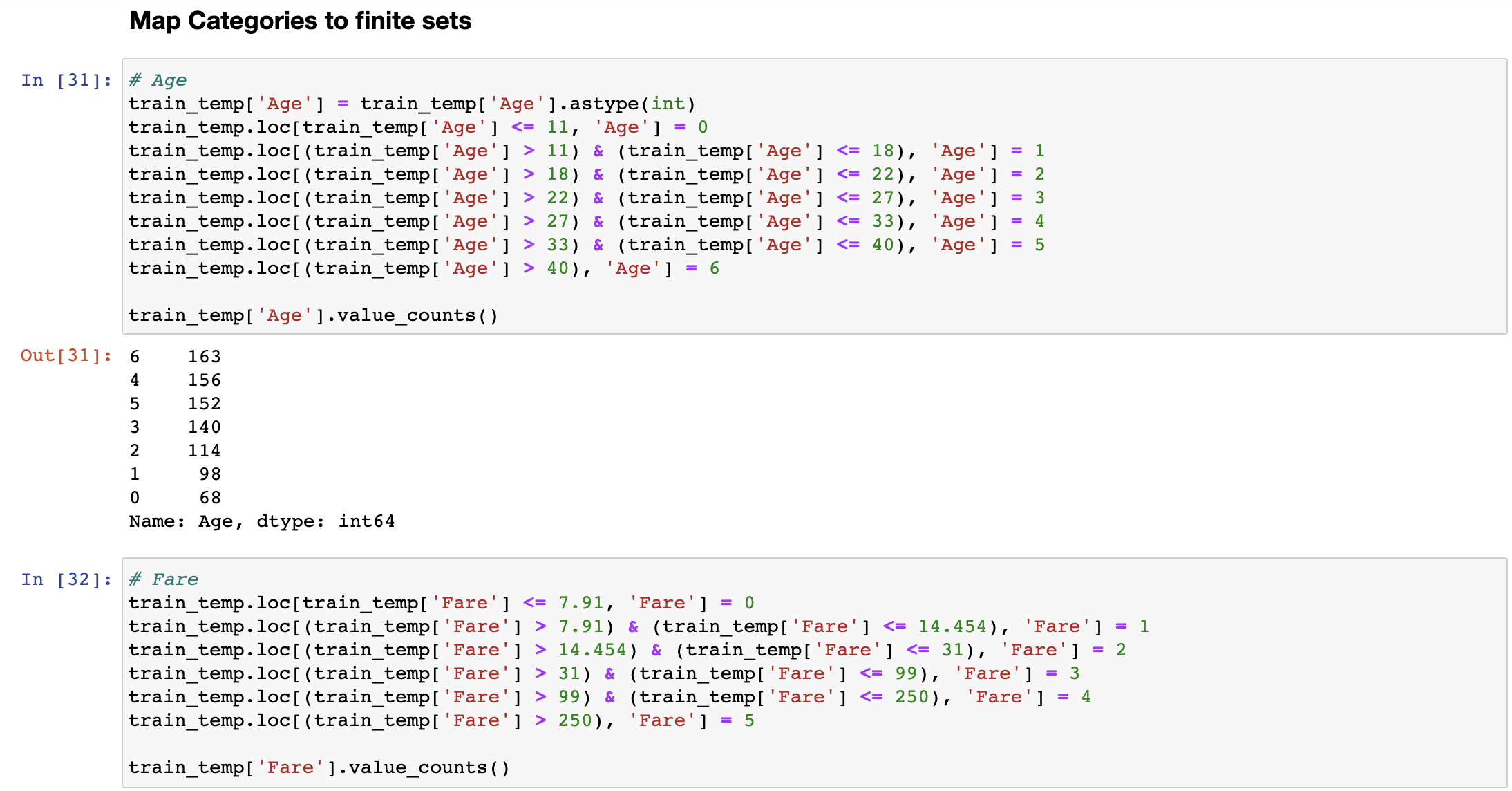 나이는 0세부터 70세 이상까지 촘촘하게 분포되어 있어서 이를 특정 나이대로 분류하여 앞선 데이터셋들처럼 나누어주기로 했습니다. 나이가 증가함에 따라 생존률이 증가하거나 감소하는 선형 관계를 나타내고 있는 것도 아니며, 카테고리로 나누어서 해당 그룹의 생존률을 비교할때 더 유의미한 상관관계를 보이는 것을 확인하였기 때문입니다.