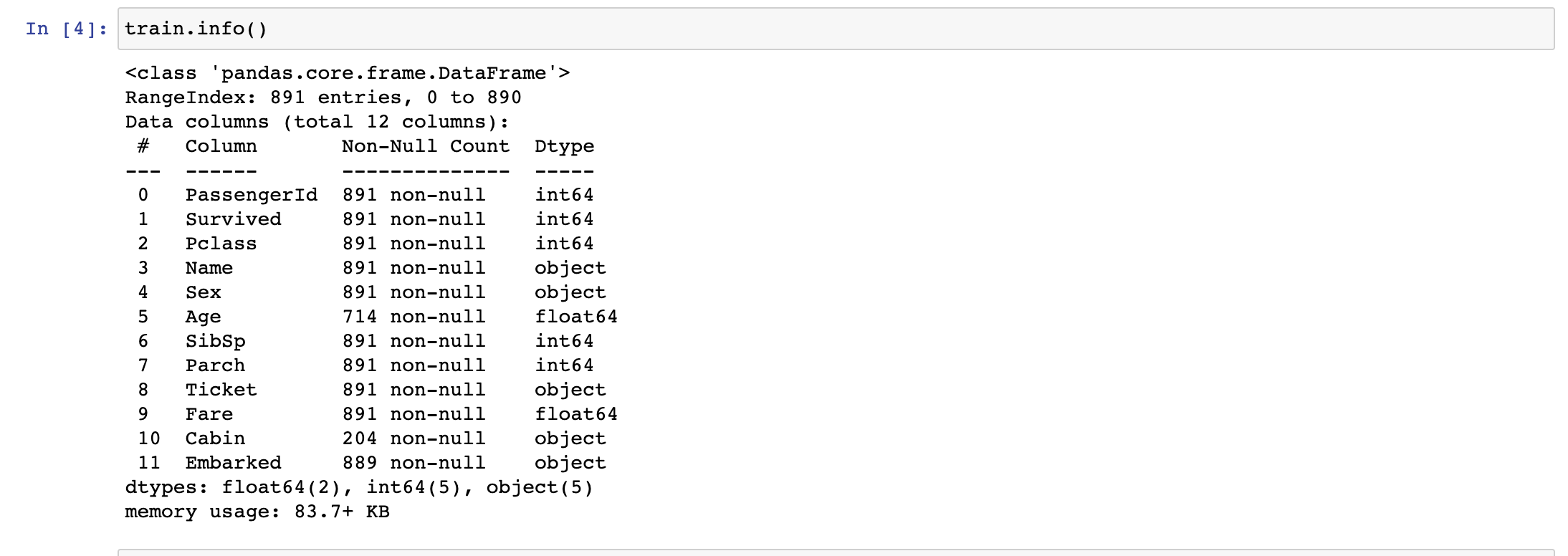 train.info() 메서드를 통해 데이터가 충분히 갖추어져 있는지, 어떤 타입의 데이터인지를 확인해 줍니다.