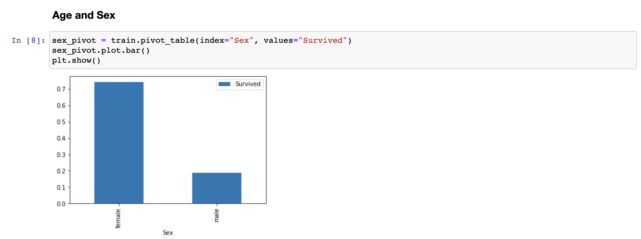 성별의 경우 여성이 남성보다 압도적으로 생존율이 높은 것을 확인할 수 있습니다. 적어도 이 데이터셋에서는 성별이 생존율을 결정하는 데 있어서 상당히 유의미한 요소로 보입니다.