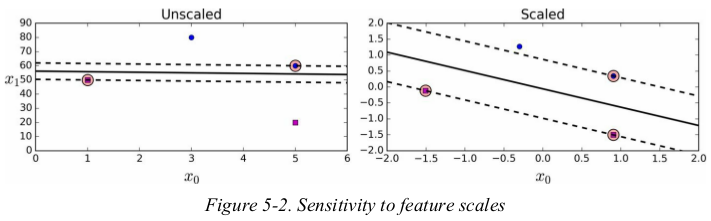 SVM은 Feature Scale에 민감하게 영향을 받는 모델 중의 하나입니다. 왜냐하면 결정 경계를 정하는 과정에서 어느 한 특징이 다른 특징보다 훨씬 큰 스케일을 갖게 되면, 그 두 특징 사이에 형성되는 기울기 자체가 무의미해지고 결국 스케일이 작은 특성이 완전히 무시되기 때문입니다.