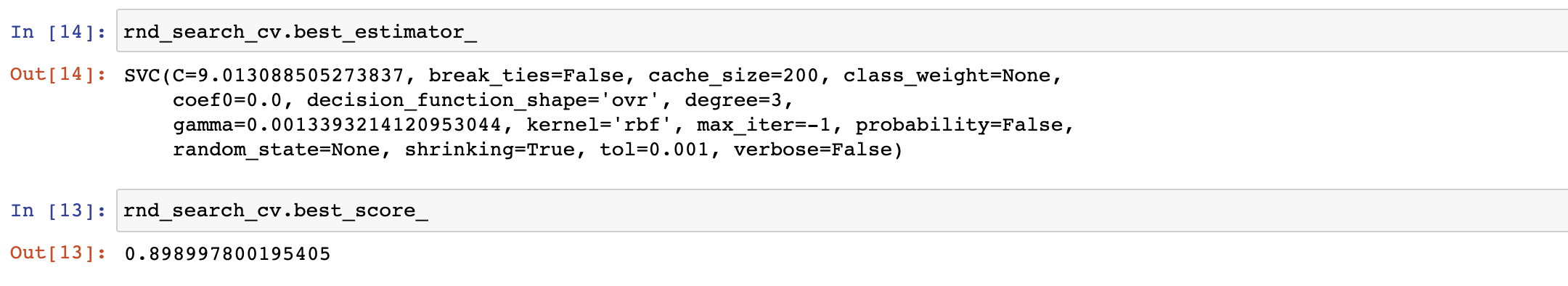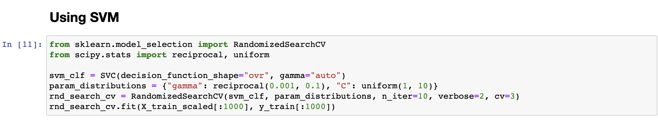 SVM 모델도 학습 방법은 LinearSVM모델과 동일합니다. 다만, SVM모델은 앞서 언급한 바와 같이 One vs One의 전략을 취하기 때문에 LinearSVM 모델의 학습보다 시간이 훨씬 더 오래 걸린다는 단점이 있습니다.