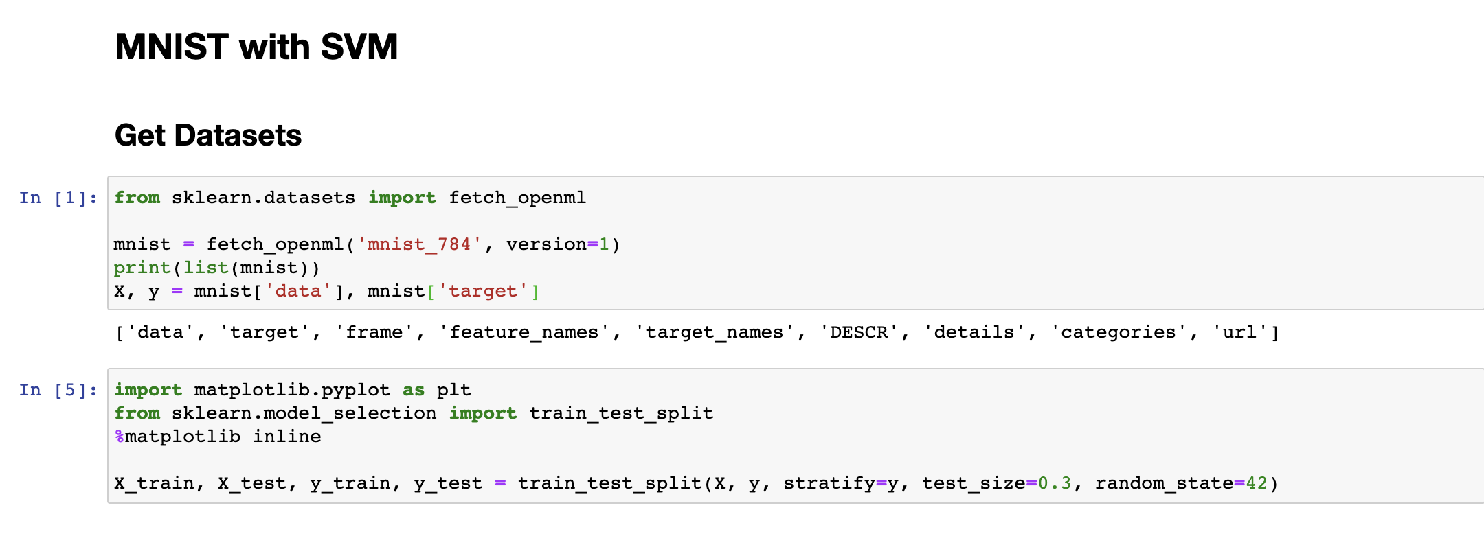 지난 MNIST 포스팅 에서는 Random Forest를 이용해 간단한 MNIST 분류 모델을 만들었습니다. 이번에는 SVM을 이용해서 MNIST 분류 모델을 만들어보고자 합니다. MNIST 데이터셋은 모든 Input이 0~255 사이의 픽셀 값이므로 따로 polynomial한 Feature들을 추가하지 않고 Linear Model을 사용하여 분류하였습니다.