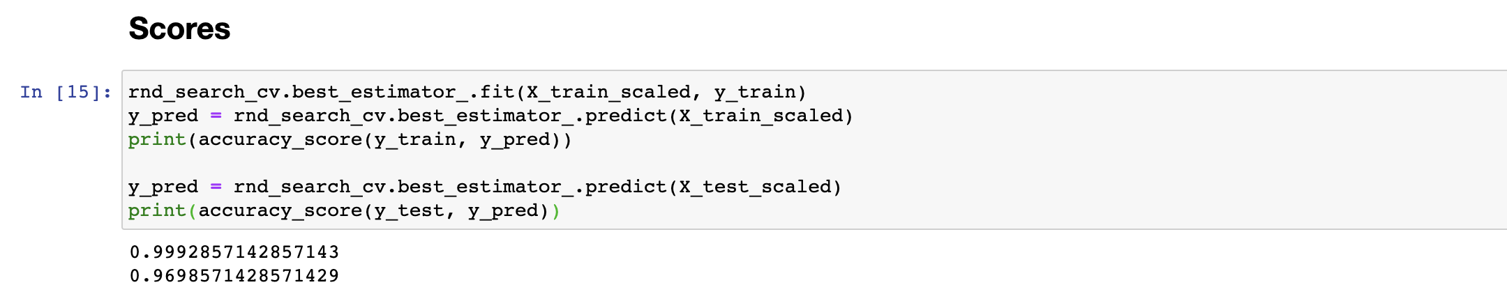 따라서 StandardScaler를 통해 데이터 스케일링을 한번 해주고 다시 학습을 진행합니다. 이 경우 92.6%로 기존보다 훨씬 더 정확한 값을 가져오는 것을 확인할 수 있습니다. RandomSearch 나 GridSearch를 이용해서 적절한 하이퍼 파라미터를 넘겨준다면 97%에 가까운 정확도를 달성할 수 있습니다.