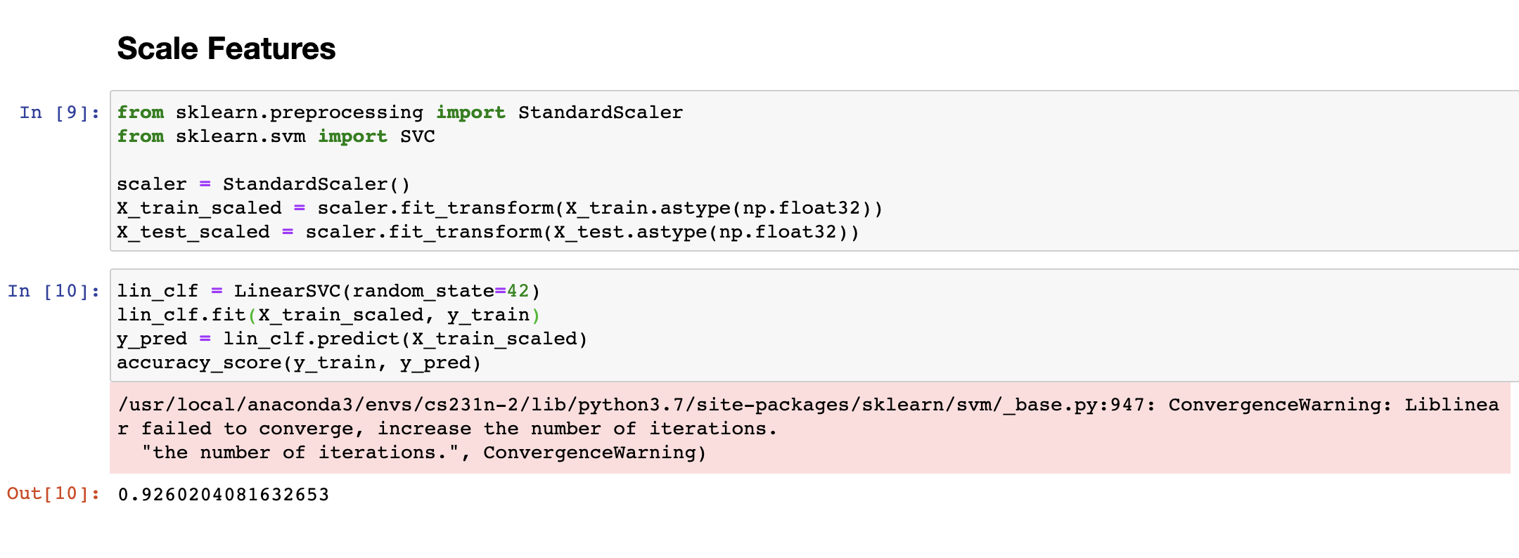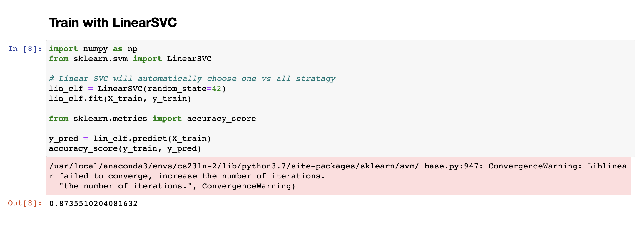 LinearSVC 모델을 아무런 전처리 없이 한번 실행한 결과 Training Set에서 87.3% 정도의 정확도를 보이는 것을 알 수 있습니다. 지난 RandomForest Classifier를 사용했을 때 Cross Validation Set에서 97% 정도의 정확도를 보였던 것과 비교하면 성능이 좋아보이지는 않습니다.