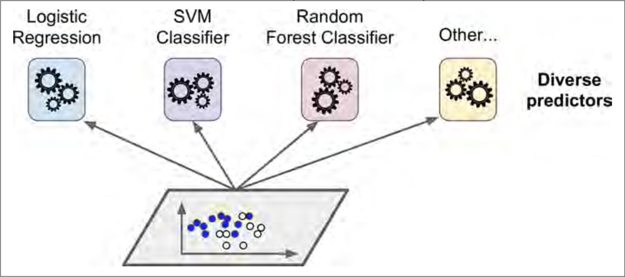 앙상블 학습은 어떤 데이터가 주어졌을 때(분류 문제라고 합시다.), 그 데이터가 어떤 클래스에 속할지를 일련의 예측기(Classifier), 즉 분류나 회귀 모델로부터 예측들을 모아서 결정하는 방식입니다. 아래 그림과 같이 선형 분류기, SVM, 랜덤 포레스트 등 여러 가지 모델들의 예측 결과를 모아서, 가장 가능성이 높은 클래스를 결정하는 것입니다.