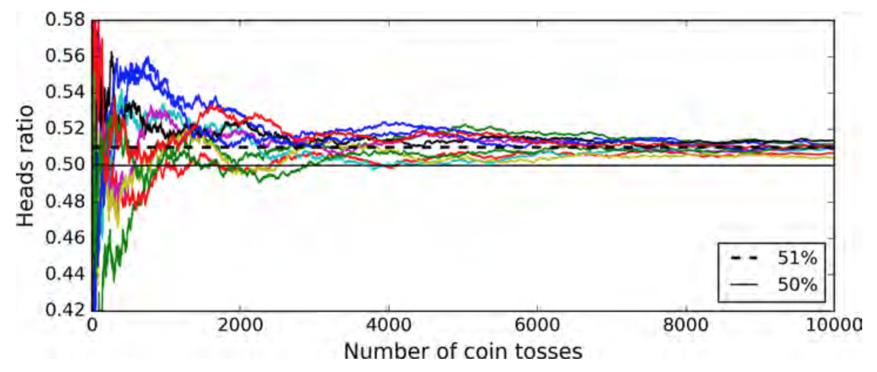 앙상블 학습을 사용하는 이유는, 앞서 언급한 것과 같이 개별 분류기보다 여러 분류기들의 예측을 합친 것이 더 정확하기 때문입니다. 이는 큰 수의 법칙(Law of Large Numbers)때문인데요, 예를 들어 앞면이 나올 확률이 51%인 조금 불균형한 동전이 있다고 가정하겠습니다. 이 동전을 1000번 던졌을 때, 앞면이 절반 이상 나올 확률은 75%가 넘는다는 것은 다항 분포를 통해 확인할 수 있습니다.
