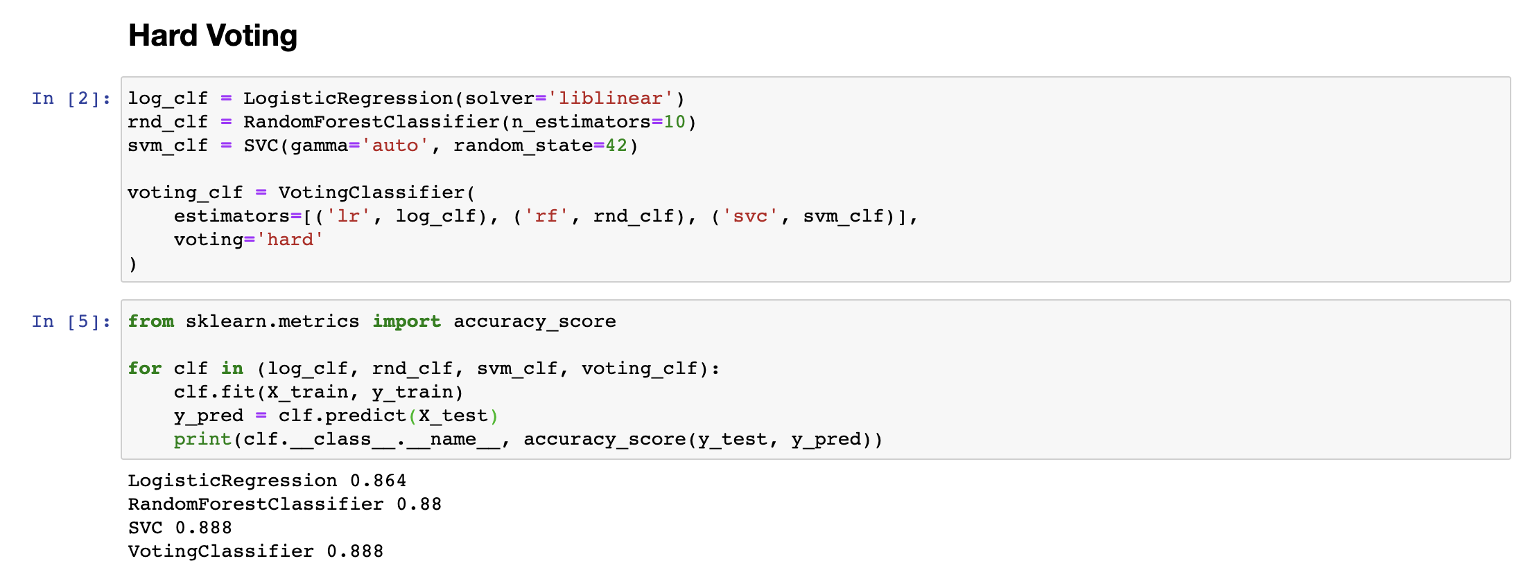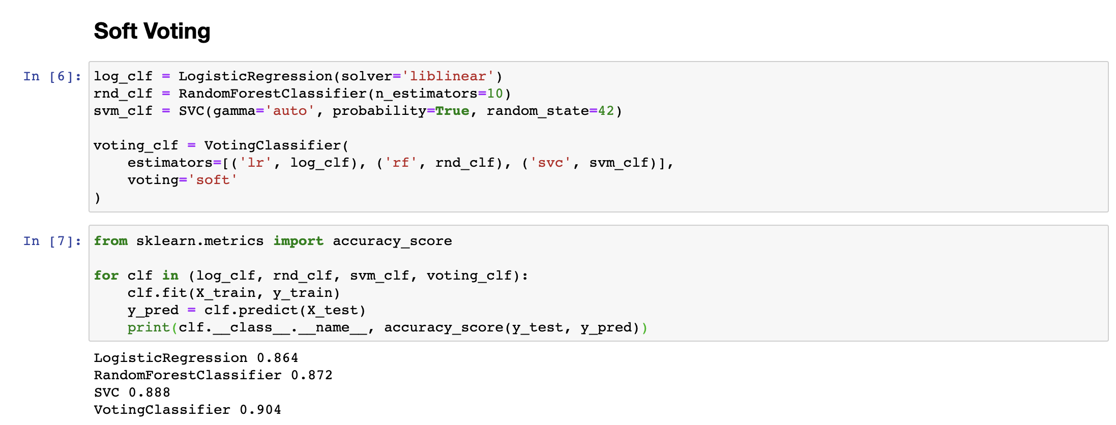 반면 Soft한 방식은 간접투표(Soft voting)이라고 불리며, 여러개의 분류기가 각각 얼마만큼의 확률로 클래스를 예측했는지를 평균내어 결과를 예측합니다. 이 경우에 특정 클래스의 확률을 높게 예측한 경우, 해당 분류기에 더 가중치가 붙게 되므로, 더 정확한 예측이 가능하다는 장점이 있습니다. 아래 실험결과를 보면, Soft Voting의 경우, Hard Voting보다 결과가 더 정확한 것을 확인하실 수 있습니다.