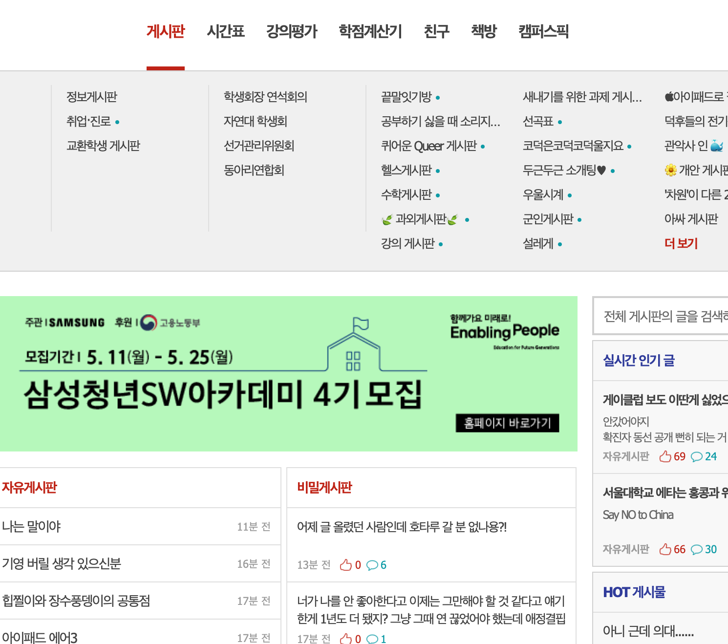 성공적으로 위 코드가 실행되었다면 다음과 같이 로그인된 에브리타임 메인 페이지가 나옵니다.