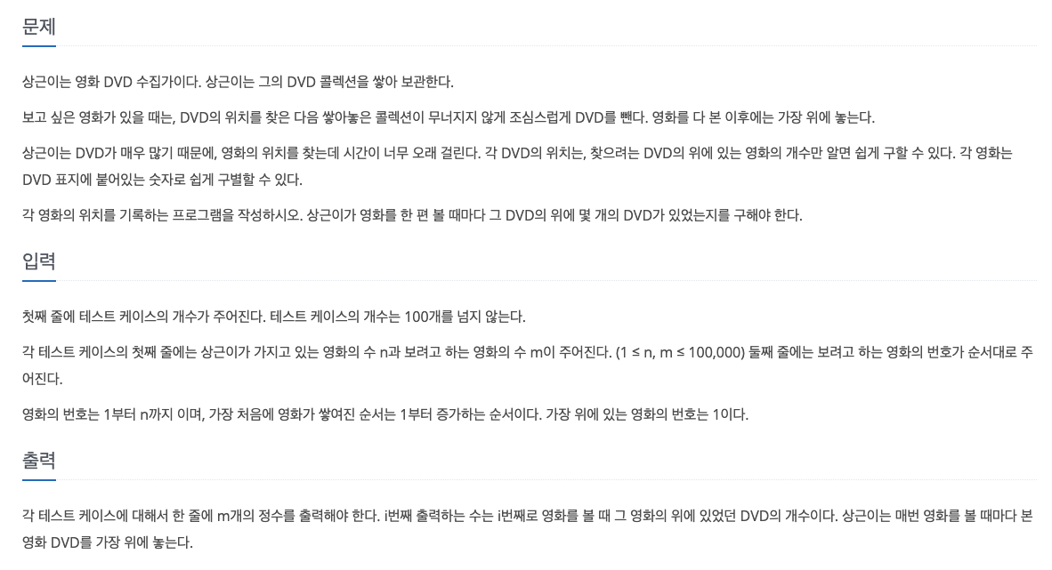 펜윅 트리로 검색해서 들어갔던 문제이기 때문에 어떻게든 펜윅 트리를 사용해서 풀어야 한다는 강박관념이 있었던 문제였습니다. 펜윅트리는 저번 포스팅에서도 간략하게 설명했지만 구간합을 빠르게 구하기 위해 사용되는 알고리즘입니다. 따라서 문제의 핵심은 특정 영화의 앞에 놓여있는 영화의 개수를 어떻게 구간합으로 표현할 것인가?입니다.