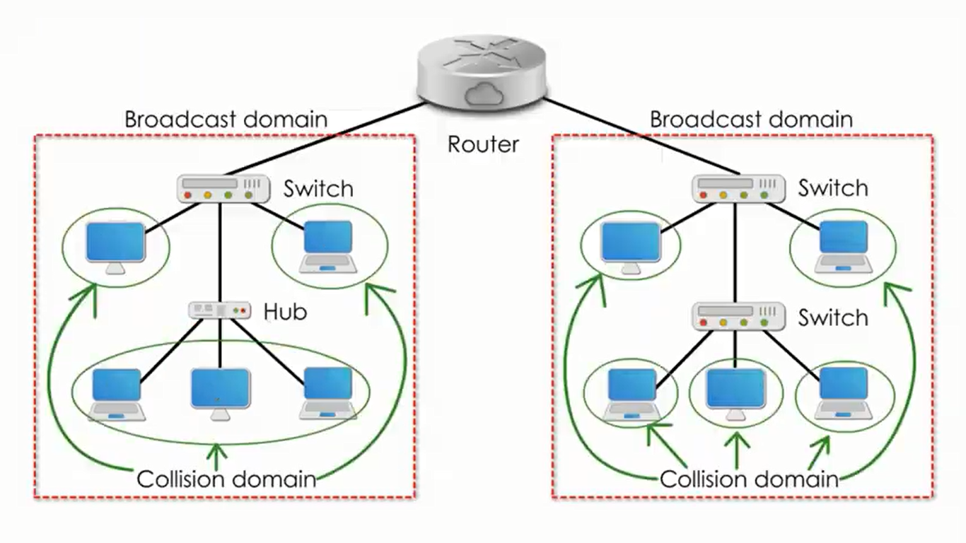 이 때, 서로 신호의 충돌을 감지할 수 있는 영역을 콜리전 도메인(Collision Domain)이라고 합니다. 다시 말해서 같은 콜리전 도메인 영역 안에 들어 있는 컴퓨터들은 서로 동시에 메세지를 보냈을 경우 충돌하며, 따라서 하나의 컴퓨터가 메세지를 보낼 때까지 기다렸다가 다음 컴퓨터가 메세지를 보내야 합니다.