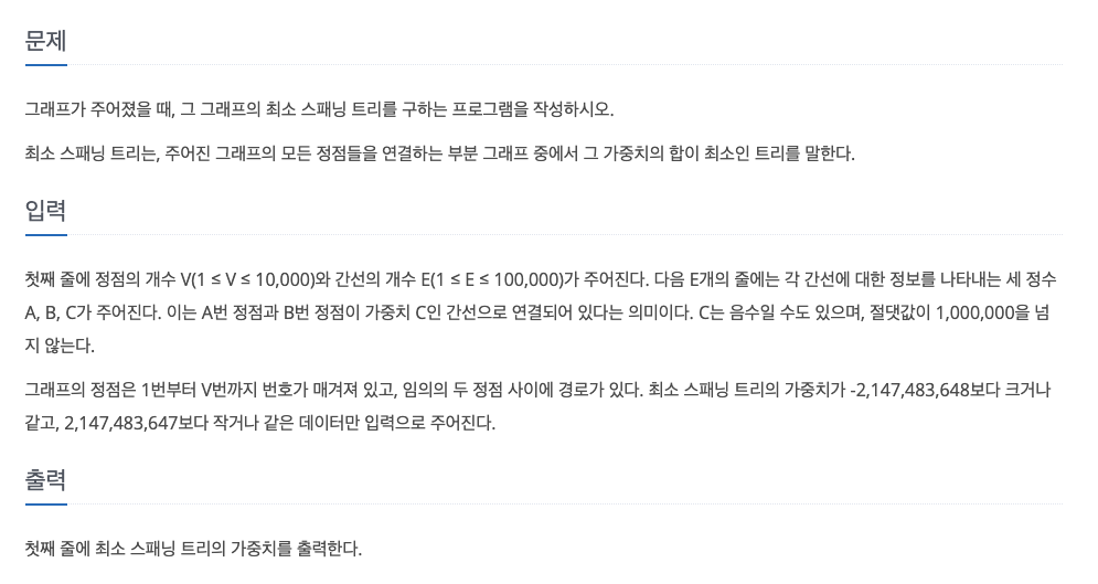최소 스패닝 트리를 구하는 데에는 크게 2가지 알고리즘 (크루스칼 알고리즘, 프림 알고리즘)이 알려져 있습니다. 위 문제는 최소 스패닝 트리의 가중치 값을 묻는 기본적인 문제이기 때문에, 개인적으로 구현하기 편했던 크루스칼 알고리즘을 사용하였습니다.