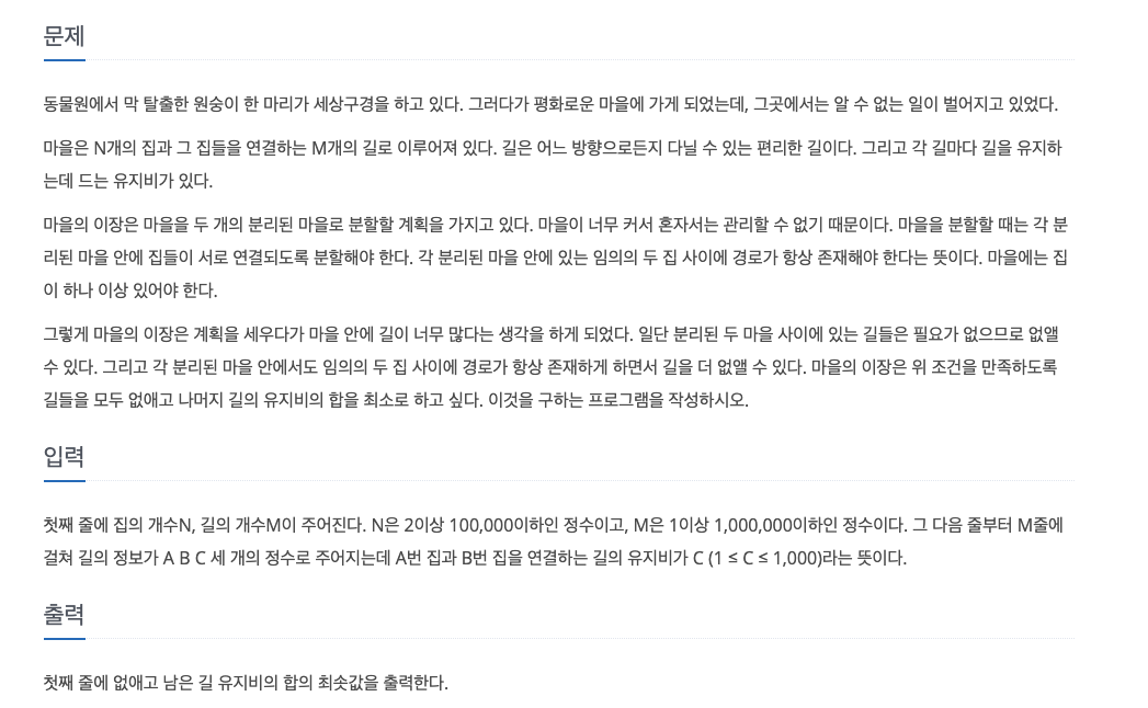 이전 포스팅에서 다루었던 최소 스패닝 트리 문제를 아주 간단하게 응용하여 풀 수 있는 문제입니다. 최소 스패닝 트리를 이전과 마찬가지로 구하고 나서, 최소 스패닝 트리를 잇는 가장 가중치가 큰 간선을 제외하면 가장 작은 비용으로 두 마을을 나누어줄 수 있습니다. 따라서 최소 스패닝 트리를 생성할 때에 추가되는 간선의 가중치 중, 가장 큰 값을 저장해두었다가 트리의 생성 비용에서 제거해주면 됩니다.