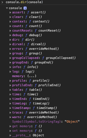 주어진 Javascript 객체의 속성 목록을 "상호작용 가능한", 즉 콘솔에서 수정할 수 있도록 한 형태로 표시해줍니다. 객체의 값을 펼쳐서 자세한 내용들을 참조할 수 있습니다.