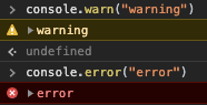console.log와 기본적으로 동일한 역할을 하지만, 브라우저의 콘솔창에 나타나는 모양이 조금 다릅니다. warn는 노란색 경고 메세지로, err는 빨간색 에러 메세지로 출력이 됩니다.