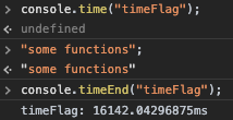 console 객체를 통해서 각 명령어 사이에 소요 시간들을 확인할 수 있습니다. console.time("flag 변수")와 console.timeEnd("flag 변수")를 실행하면 두 console사이에 소요된 시간들을 쉽게 확인할 수 있습니다. 코드를 최적화하거나, 어떤 메서드에서 시간이 오래걸리는지 여부등을 판단할때 용이한 메서드입니다.