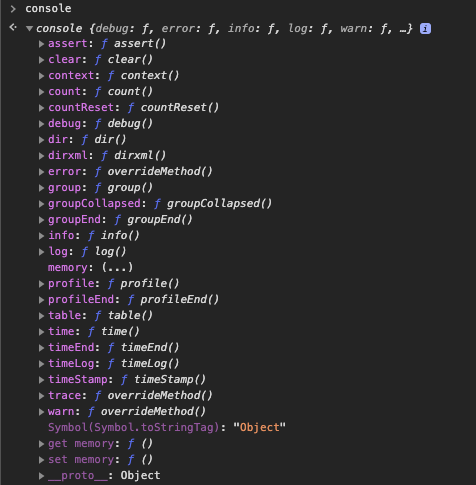 빠른 출력을 위해 console.log만 사용하다 보니 console.log를 그냥 하나의 메소드인것처럼 생각할 때가 많습니다. 물론 .log 자체는 메서드가 맞지만, console은 Javascript언어가 지원하는 엄연한 객체입니다. 웹 브라우저는 자바스크립트를 통해서 동적으로 컨텐츠를 할당하는 등의 명령들을 수행하기 때문에 웹 브라우저의 개발자 도구를 통해서 console 객체의 여러 정보를 확인할 수 있습니다.