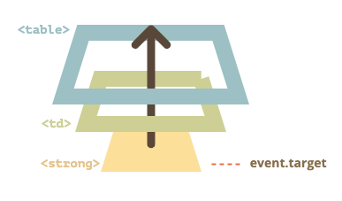 이벤트 델리게이션을 언급하기 위해서는 먼저 간단하게 자바스크립트의 이벤트 전파 방식에 대해서 언급해야 합니다. 예를 들어 다음과 같이 이 2개 계층의 부모를 가진 자식 div를 클릭하는 클릭 이벤트가 발생했다고 가정하겠습니다.