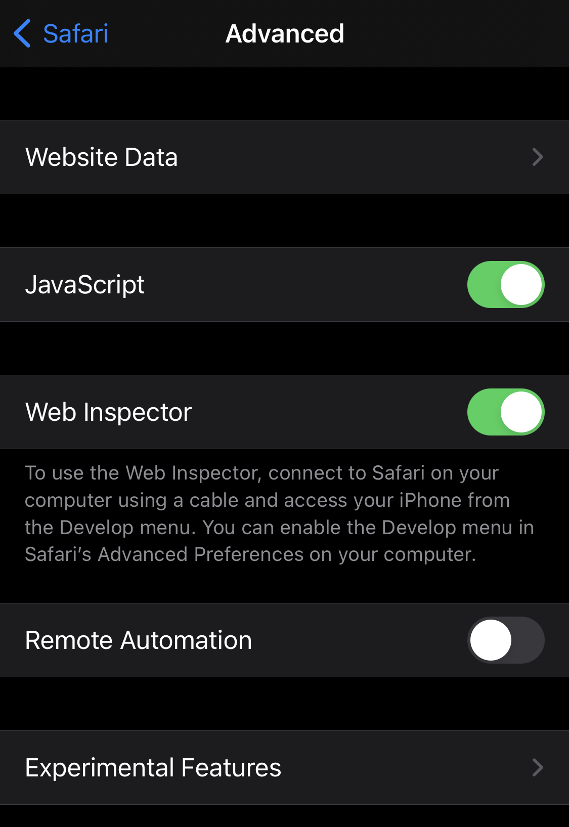 데스크톱 설정을 마친 뒤에는 데스크톱에서 디바이스의 Safari 브라우저를 인스펙터 할 수 있도록 설정을 허용해주어야 합니다. 다음과 같이 Setting -> Safari로 들어간 후에 화면 제일 하단의 Advanced를 클릭합니다. 다음과 같은 화면이 나오는데, 여기서 Web Inspector설정을 켜줍니다. (Javascript는 기본으로 켜져 있습니다.)