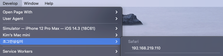 위의 두 설정을 모두 마치고 난 후, 디바이스에서 Safari를 통해 내 로컬 호스트에 접속합니다. 내 디바이스를 데스크탑에 연결하고 상단 메뉴바의 Develop 탭을 클릭하면 다음과 같은 화면이 나타나는 것을 확인할 수 있습니다. 화면에 나타난 로컬호스트 주소에 연결하면 Safari의 Inspect창이 나타나게 되고, Inspect화면에서 수정한 사항들이 내 디바이스의 Safari에 반영되며, CSS, DOM 등의 수정 사항을 내 디바이스에 즉시 반영할 수 있습니다.