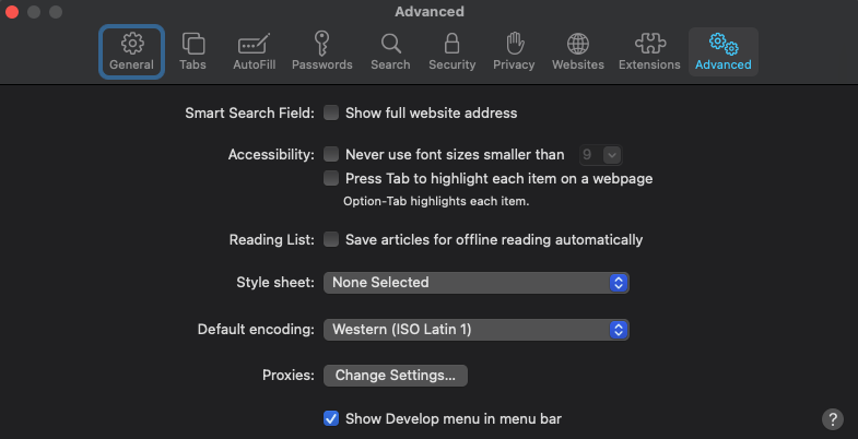 Advanced탭에 들어가서 제일 하단 체크박스 (Show Develop menu in menu bar)를 체크해 줍니다. 체크하고 나면 데스크탑 화면 제일 상단 상태바에 Develop 탭이 나타납니다.