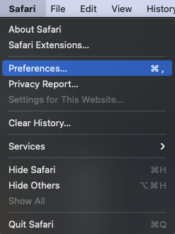 우선 Safari를 통해 inspect 하는 방법에 관한 글이므로 데스크톱에서 Safari를 켭니다. 화면 제일 상단 상태바에서 Safari를 누르고 Preference 탭을 클릭합니다.