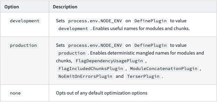 공식문서에 따르면 Mode의 경우에는 predefined된 값을 사용할 수 있도록 하기 위한 설정입니다. process.env.NODE_ENV라는 환경변수를 설정해 줄 수 있습니다. 이번 포스팅의 경우에는 따로 process.env.NODE_ENV에 대해서 사용할 일은 없으므로 'none'으로 설정하였습니다.