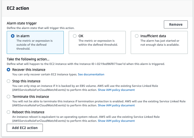 AWS에서는 "인스턴스의 상태 확인 실패" 가 아닌 "시스템 상태 확인 실패" 의 경우에 대해서 Recover Action을 제공합니다. 아래와 같이 CloudWatch Metric을 StatusCheckFailed_System으로 설정하고, 이에 대한 Action을 Recover로 설정하게 되면 시스템이 손상되거나 인스턴스가 시스템의 상태 확인에 실패했을 경우 자동으로 인스턴스를 복구할 수 있습니다.