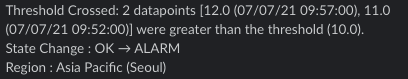CloudWatch Alarm은 AWS 리소스에 대한 실시간 모니터링을 제공하고, Alarm 하나당 CloudWatch Metric하나를 모니터링하다가 사용자가 설정한 임계치를 돌파했을 경우 "In Alarm" 상태로 바뀌어 이후 동작을 수행하게 됩니다. SNS Topic을 사용해서 Slack, Email등을 통해 알림을 주기도 하고 기본적으로 제공하는 Action을 통해 인스턴스를 복구하거나, 재시작하는 등의 동작을 수행할 수 있습니다.