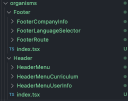 아래의 예시에서 Footer, Header를 구성하는 FooterCompanyInfo, FooterRoute, HeaderMenu등을 organisms나 molecules에 그냥 넣어둔다고 한다면(CompanyInfo, Route, Menu등으로 재사용가능해보이는 이름을 가지고) 실제로 Footer의 CompanyInfo를 수정하고 싶을때, 이 CompanyInfo를 Import하고 있는 다른 컴포넌드들은 없는지, 사이드이펙트를 고려하며 개발해야 하지만, 아래와 같이 도메인을 명확하게 분리하고, 기능과 상관이 없는 뷰들은 atomic components에 포함시키지 않는다면, 위와 같은 사항들을 고려할 필요가 없습니다.