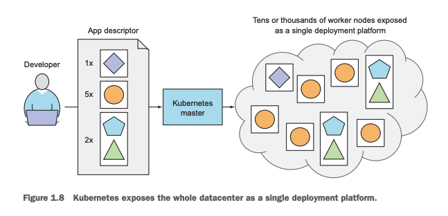 개발자가 애플리케이션이 어떻게 구성되어야 하는지를 쿠버네티스 시스템에게 알려줍니다. 예를 들어서 1번 애플리케이션은 3개의 컨테이너로 구성되고, 2번 애플리케이션은 10개... , 3번과 4번은 같은 컨테이너 안에서 동작해야 하고...