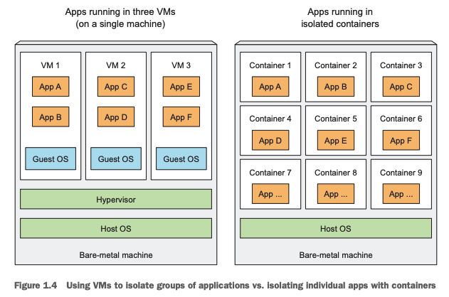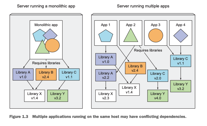 위에서 살펴본 것처럼, 마이크로 서비스를 구성하는 여러 애플리케이션 (e.g 검색 서버, 동영상 서버, 이미지 서버, 어카운트 서버, 멤버쉽 서버 등등)들은 각각 다른 언어로 개발될 수 있으며, 같은 언어로 개발되더라도 서로 다른 버전의 라이브러리를 사용해서 개발 될 수 있습니다. 따라서 각각의 서비스들을 같은 서버 노드(Worker)에 올려서 실행할 때는 (e.g 검색 서버와 동영상 서버를 같은 클라우드 컴퓨팅 노드에서 실행) 환경의 격리가 필수적입니다.