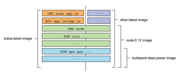 - 받아온 여러 이미지 레이어를 차례로 쌓아올린 다음(해당 이미지 레이어들은 Read-Only), 새로운 이미지 레이어 (위 예시에서는 ADD, CMD로 기술된 레이어 2개)를 쌓아 올려 새로운 이미지를 만듭니다.