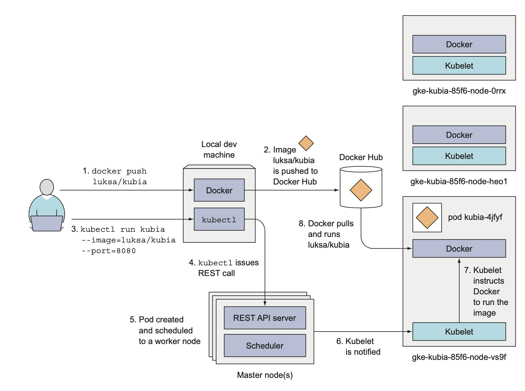 위의 명령어를 실행했을때 실제로 쿠버네티스에서는 어떤 일이 일어나는지 확인해보겠습니다. 도커 이미지를 생성하는 과정은 위에서 설명하였으므로 생략하도록 하겠습니다.