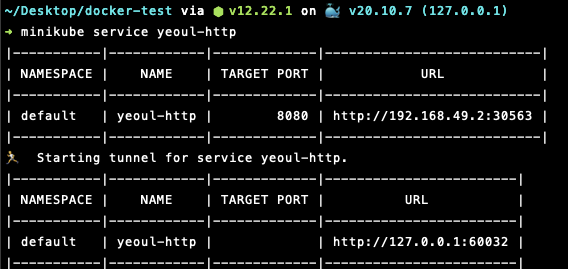 minikube를 사용하는 경우 minikube는 자체적으로 LoadBalancer 서비스를 제공하지 않기 때문에 다음과 같이 minikube service를 이용하여 Pod에 접근할 수 있습니다.