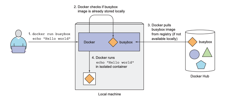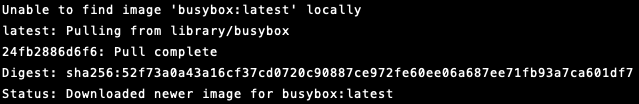 docker run 커맨드를 실행하면 로컬 머신에 해당 이미지가 존재하지 않아도 애플리케이션이 잘 실행되는 것을 알 수 있습니다. 이는 도커가 로컬 머신의 해당 이미지의 존재 여부를 확인하고, 있으면 해당 이미지를 사용해서 애플리케이션을 실행하고, 없으면 도커 이미지를 모아놓은 Remote Repository(Docker Hub)를 찾아서 다운받기 때문입니다. (pulling from library/busybox) 만약 Remote Repository에도 해당 이미지가 없거나 권한이 없는 상태에서 private repository의 image를 pull 하려고 시도하는 경우에는 docker run이 실패하게 됩니다.