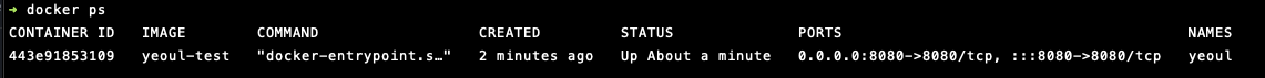 docker run --name yeoul -p 8080:8080 -d yeoul-test