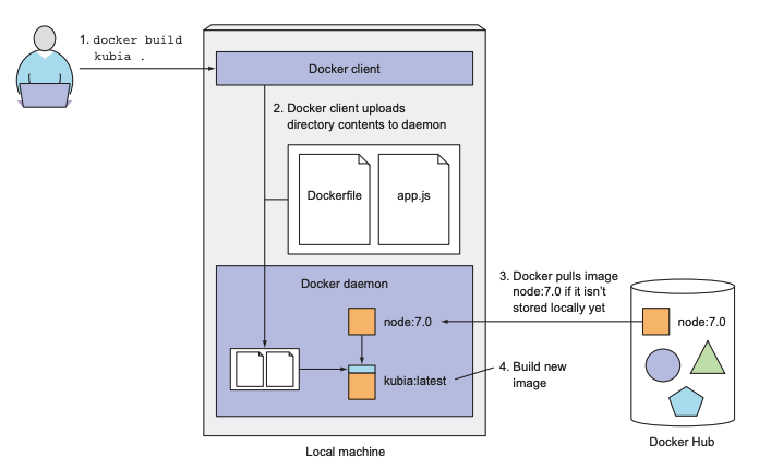 - 도커 데몬은 Dockerfile을 읽어서 이미지를 만드는데 필요한 레이어(이미지)들을 로컬 머신에서 찾고, 없는 경우에는 Docker Hub에서 pull 받아옵니다.