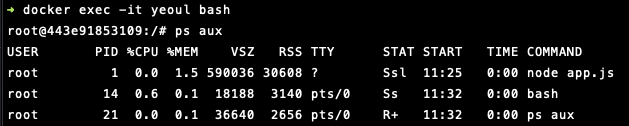 해당 컨테이너로 직접 접속해서 컨테이너 안에서 돌고 있는 프로세스의 목록을 확인해 보면 다음과 같이 app.js가 1번 프로세스로 돌고 있는 것을 확인할 수 있습니다. 즉 완벽하게 "격리"된 상태에서 컨테이너가 돌고 있는 것입니다.