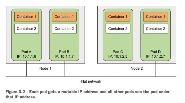 각각의 파드는 쿠버네티스 시스템 안에서 서로 소통할 수 있는 고유한 internal IP를 가집니다. 파드들이 서로 다른 노드에 속해있더라도 이 internal IP를 통해 별도의 네트워크 게이트웨이 없이 소통할 수 있습니다.