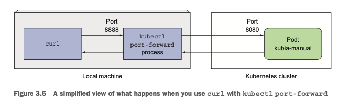 Port-Forward 기능을 사용하면 다음과 같이 로컬 머신에서 쿠버네티스의 포트포워딩 프로세스가 동작하게 되며 이 프로세스가 파드와의 연결을 처리하게 됩니다.