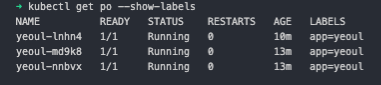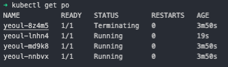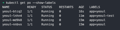 제일 위의 파드의 Label을 app=yeoul-test로 수정해보겠습니다. 파드의 레이블 수정은 kubectl label command를 사용하면 됩니다. yeoul-test로 레이블이 바뀐 파드가 바로 RC에서 빠져나가고, RC는 설정의 Replication조건을 맞추기 위해 바로 새로운 파드를 생성한 것을 확인할 수 있습니다.