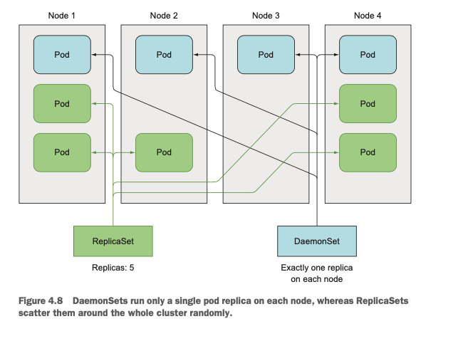 RC와 RS모두 특정한 개수의 파드를 Kubernetes cluster의 워커노드의 특정 위치에 상관없이 배포하는 것을 가능하게 합니다. 하지만 Log Collector나 Resource Monitor등의 프로세스를 담은 파드를 모든 노드에 하나씩 배포해야 하는 경우가 있습니다. 이 경우를 위해 Kubernetes에서는 DaemonSet을 제공합니다. (공식문서)