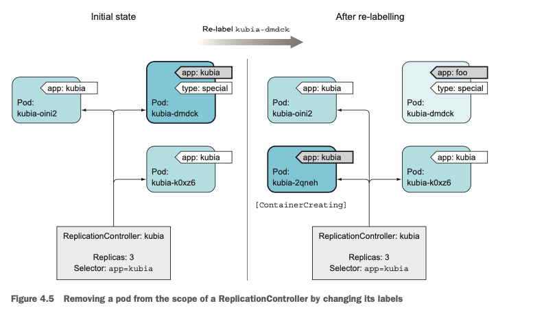 파드 자체는 RC와 묶여있지 않습니다. 오로지 label에 한정된 개념이기 때문에 label을 변경하면 해당 파드는 더 이상 RC의 통제를 받지 않으며, RC는 설정 조건을 맞추기 위해 템플릿으로부터 새로운 파드를 생성합니다.