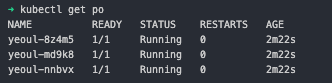RC를 생성하는 아래의 yaml 파일을 보면 replicas, selector, template 필드를 확인하실 수 있습니다. luksa/kubia라는 이미지를 사용하는 app:yeoul 레이블을 가진 파드 템플릿을 사용하며 replica(파드의 복제본)의 개수가 3개로 명시되어 있습니다. 실제로 해당 RC yaml 파일을 실행하면 다음과 같이 3개의 파드가 생성됩니다.